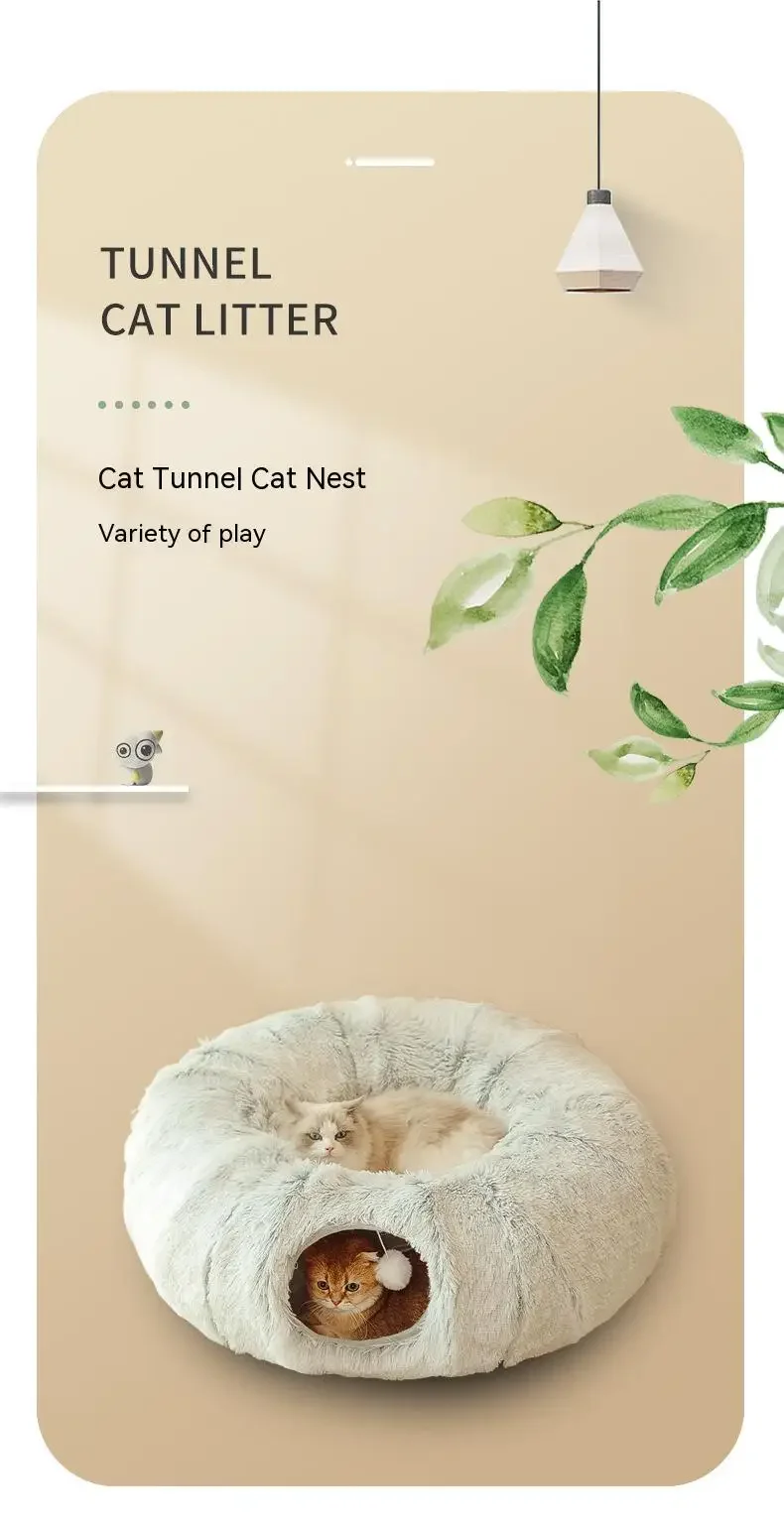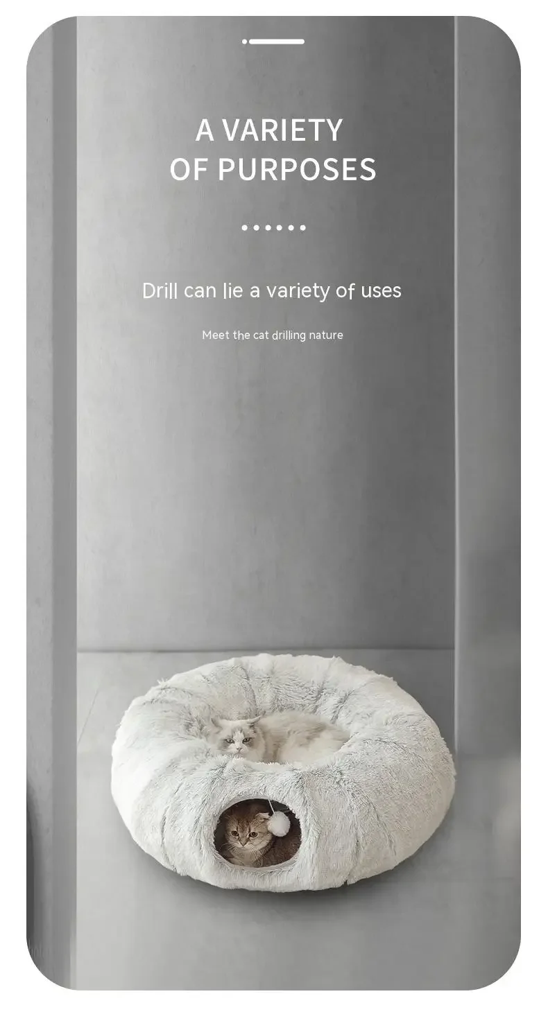 Plush Cat Bed with Tunnel For Indoor Cats Multifunctional Cat Tunnel Bed with Peephole Fluffy Donut Cat Bed with Tunnel